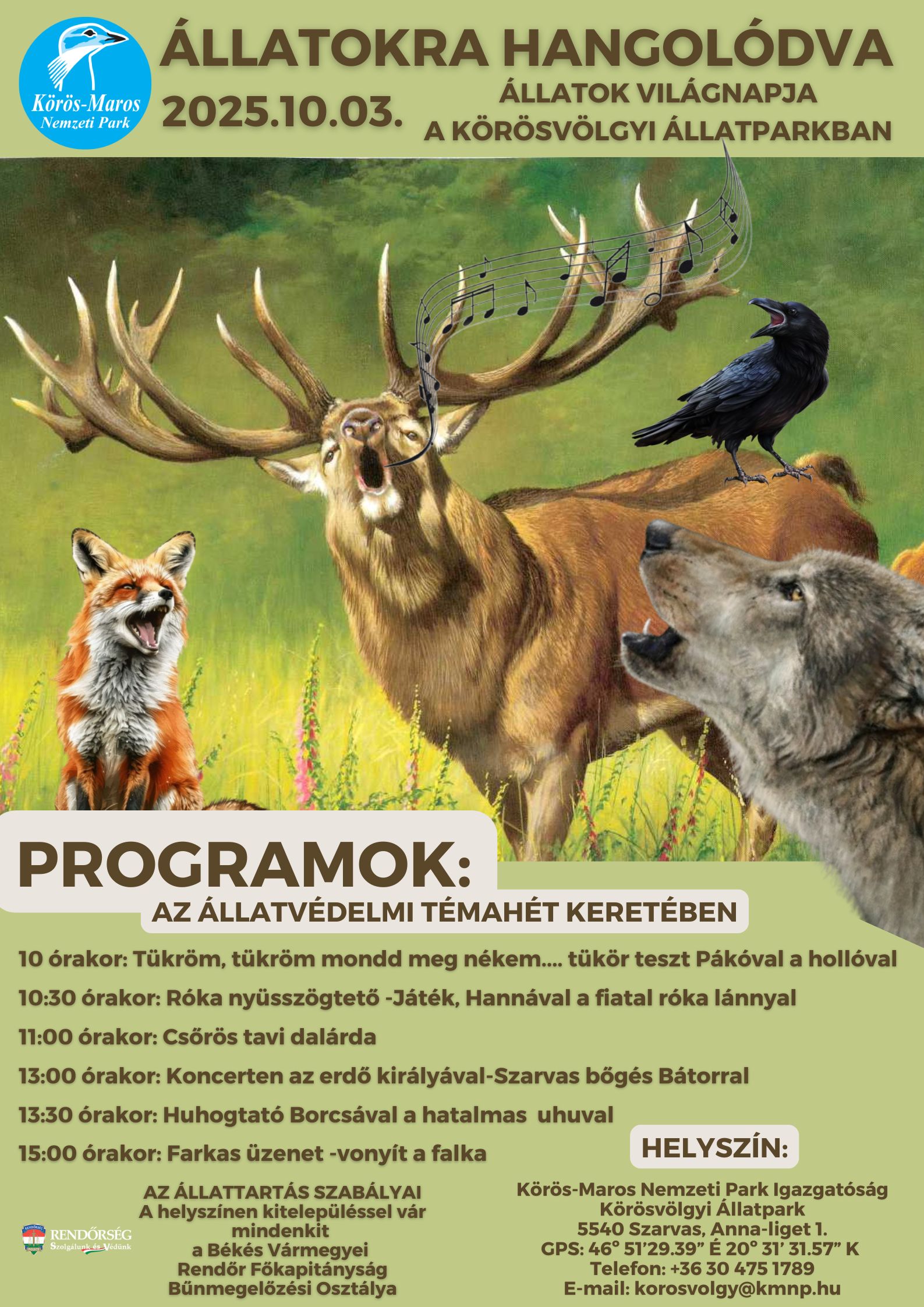 Állatok Világnapja apropóján a Körösvölgyi Állatpark állatfajain keresztül , az állatok hangjaival ismerkedünk. Vajon melyik állat, hogyan fejezi ki a mondanivalóját? Hány féleképpen tud egy állat hangot kiadni? Miért bőg a gímszarvas? Milyen egy igazi farkas üvöltés? Tud énekelni a holló? Szóra tudjuk bírni valamelyik állatot? A programon minden kiderül.